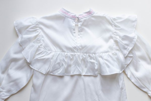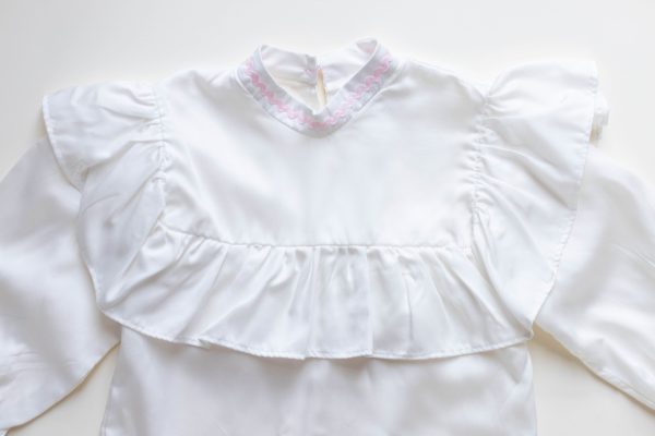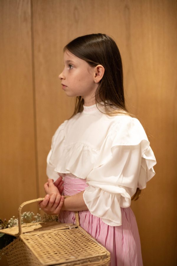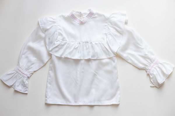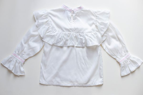 Bluza Emilia este realizata dintr-un batist alb, moale si placut la atingere, accesorizata cu o brodetie roz pal in zig zag.
