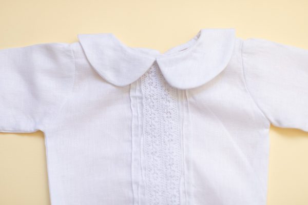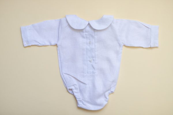 Body-ul Edison din in alb, accesorizat cu o broderie lata pe mijloc si guler rotund.