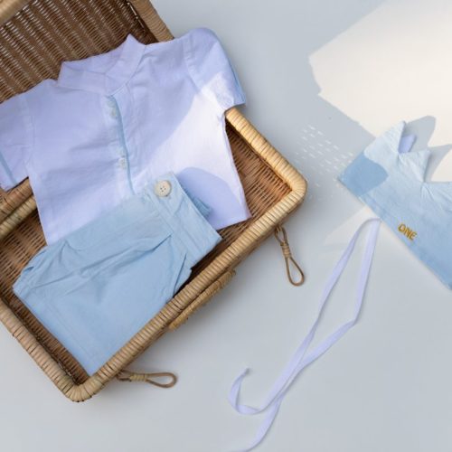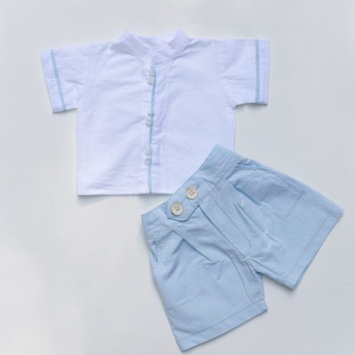 Body-ul John este realizat dintru-un bumbac alb, accesorizat cu un guler rotund și o lira din stofa bej.