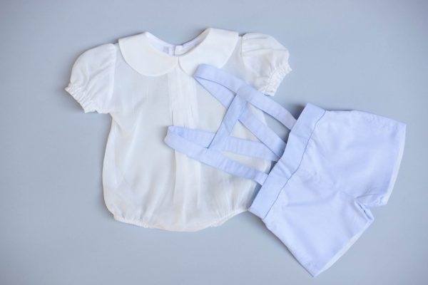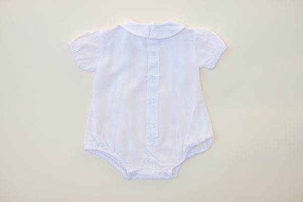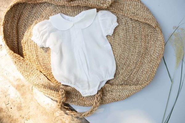 Body-ul Léo cu maneca scurta si guler rotund este realizat dintr-un bumbac moale, alb, ideal pentru pielea sensibila a bebelusilor.