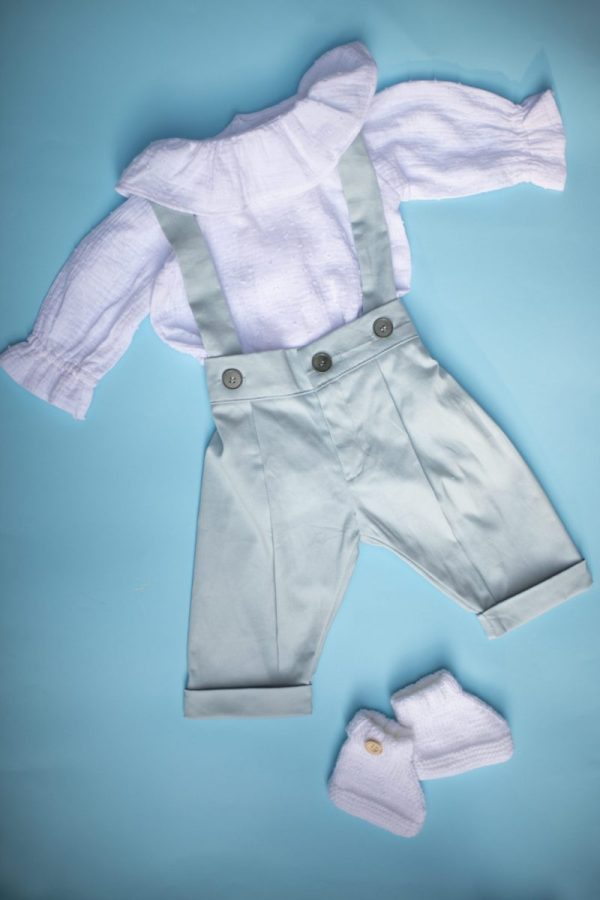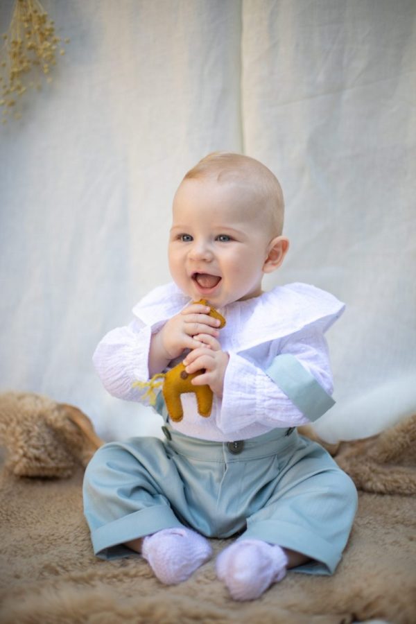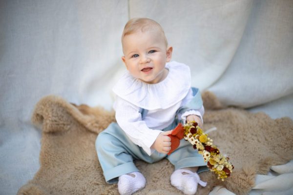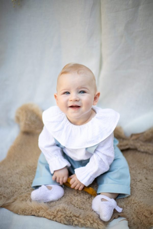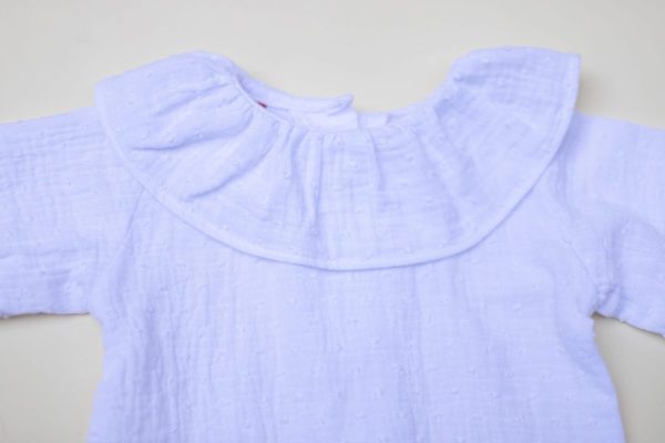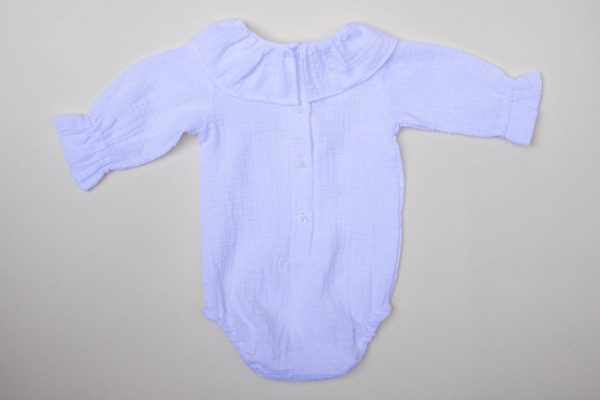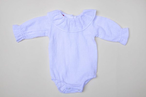 Body-ul Raphael este un model unisex, realizat dintr-o muselina alba, moale si placuta la atingere cu bulinute brodate.
