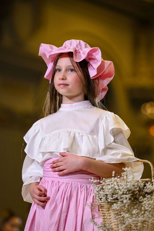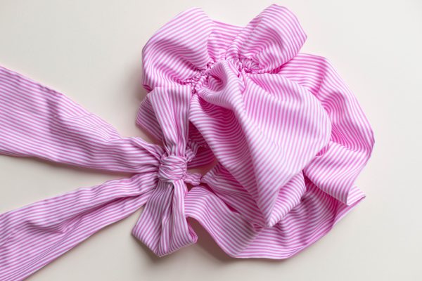 Boneta Fancy este realizata dintr-un bumbac in dungi roz cu alb, accesorizata cu un volanas dd jur imprejur si o fundita la spate.