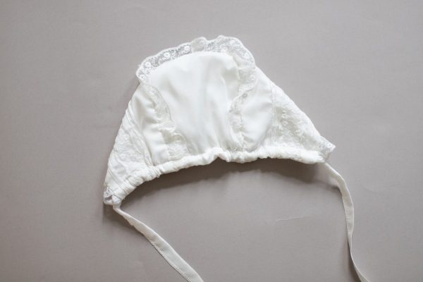 Boneta Angeline este realizata dintr-o matase naturala alba, in combinatie cu o dantela fina, iar la interior este captusita cu un bumbac alb.