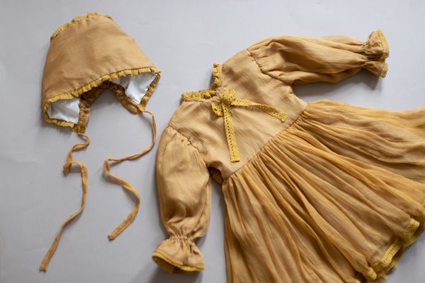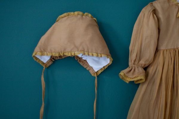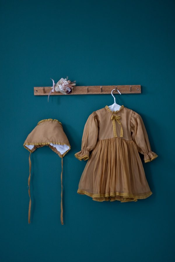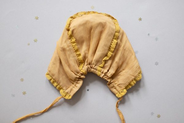 Boneta Cleo este realizata dintr-o matase naturala culoarea mustar, captusita la interior cu bumbac fin si accesorizata perfect cu o dantela din bumbac mustar.