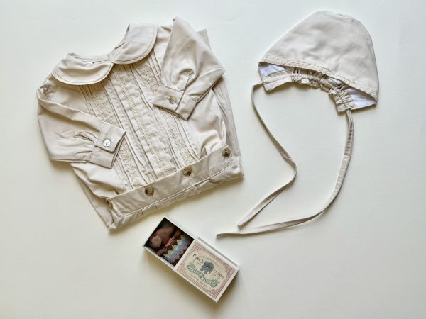 Boneta Iacob este realizata dintr-un bumbac bej, captusita la interior cu bumbac fin si accesorizata cu o dantela din bumbac natural.