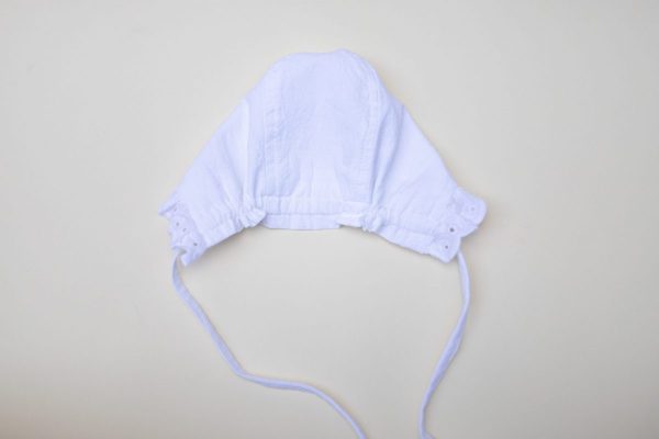 Boneta Louana este realizata din bumbac natural alb, accesorizata cu broderie alba.