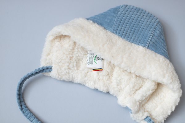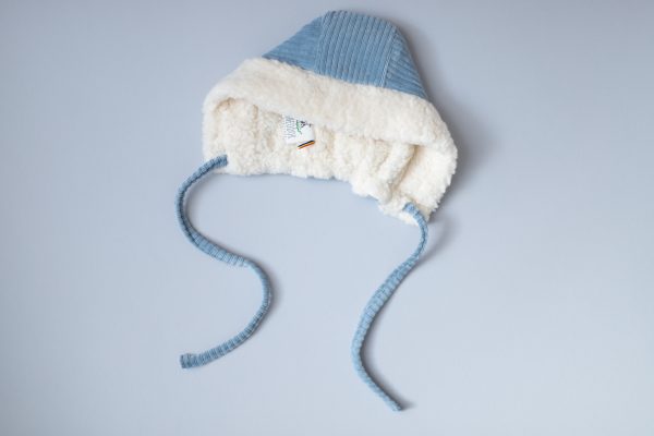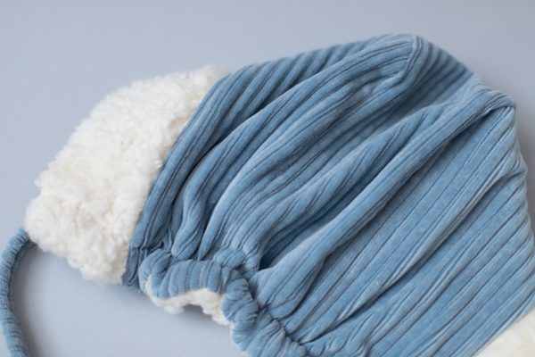 Boneta Michel este realizata dintr-un bumbac raiat bleu, fiind captusita la interior cu o blanita din bumbac ivory.