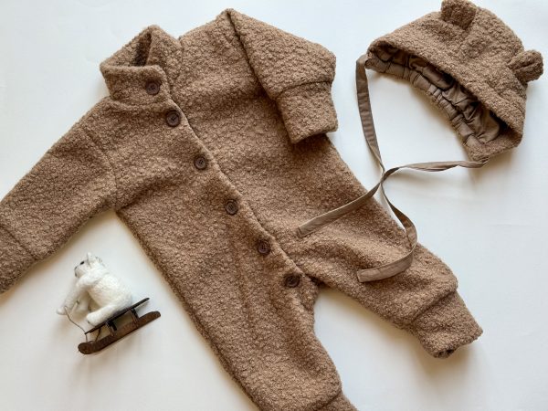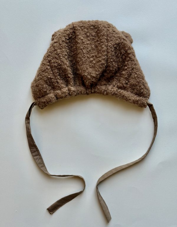 Boneta Teddy realizata dintr-un plush maro este captusita cu bumbac fin.