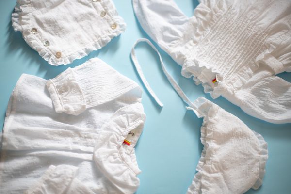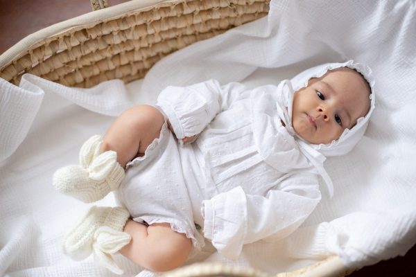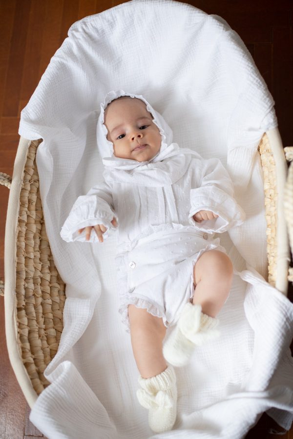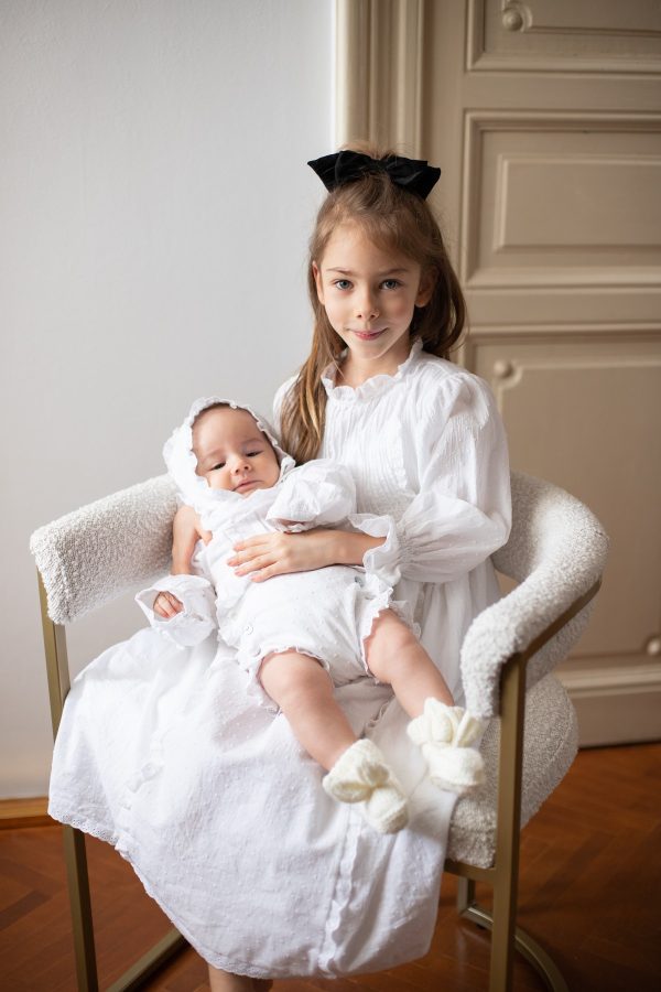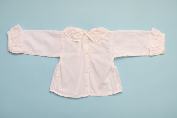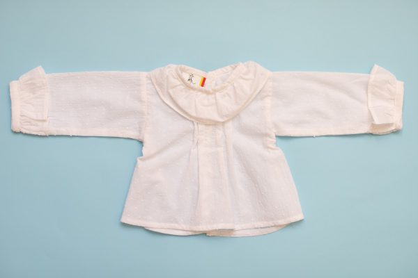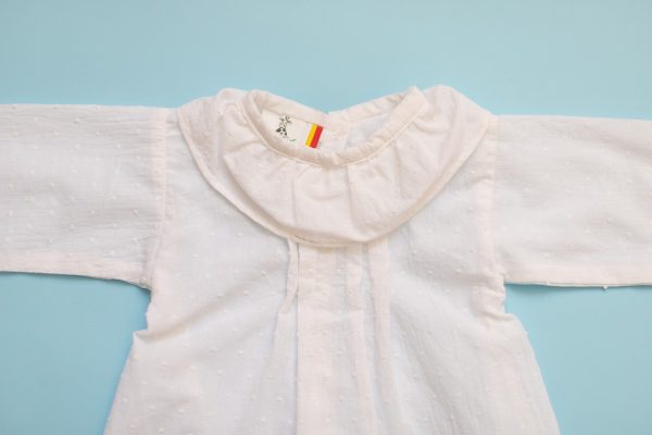 Cama Davis este realizata dintr-un bumbac alb cu buline brodate, are un guler cret si volanas la maneca.