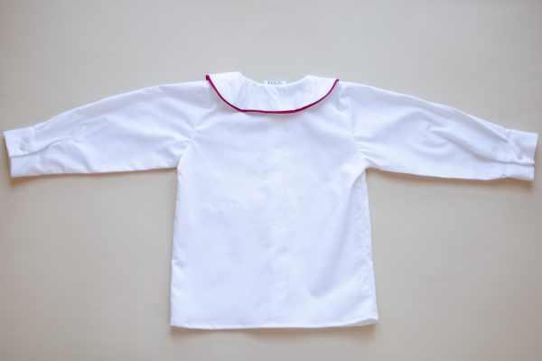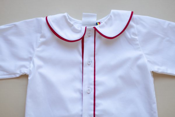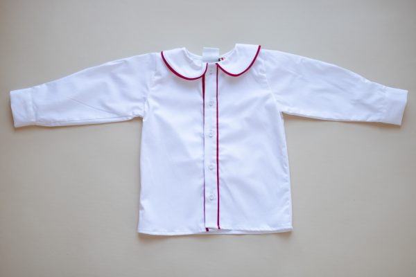 Camasa Henri este realizata dintr-un bumbac premium alb, plin, moale si placut la atingere. Este un model ideal pentru baietei, avand un guler rotund si o lira rosie la guler, manseta si in fata.