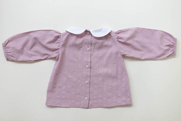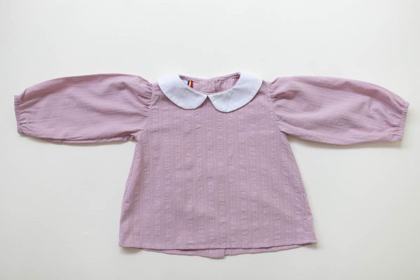 Camasa Juliene cu guler alb rotund este realizata dintr-un bumbac lila, cu maneca usor bufanta si croi lejer este perfecta pentru primavara.