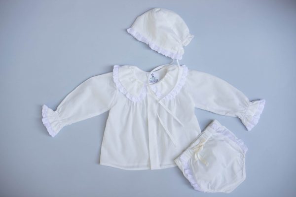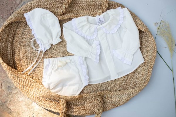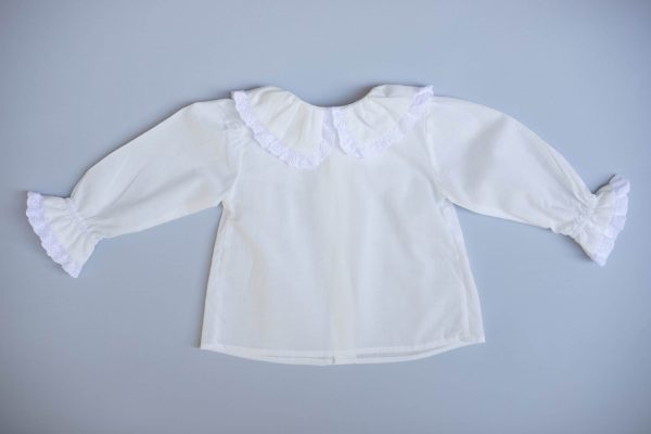 Cama Leandre este realizata dintr-o panza din bumbac 100%, accesorizata cu broderie ingusta din bumbac 100%. Camasuta are nasturi ascunsi, guler rotund si volanas la maneca, inchiderea se face in fata.