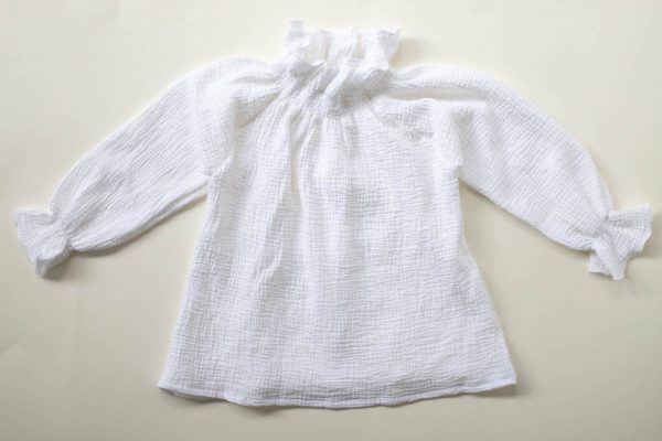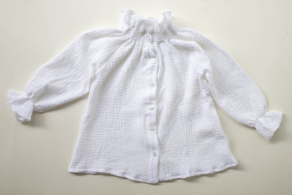 Camasa Lydie este realizata dintr-o muselina alba, are elastic la gat si manseta si nasturei albi la spate.