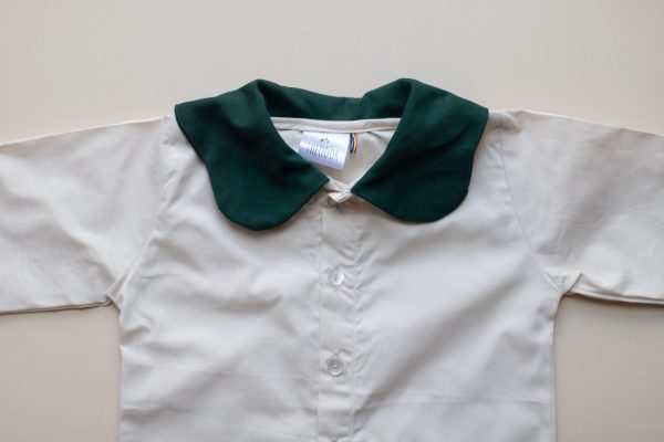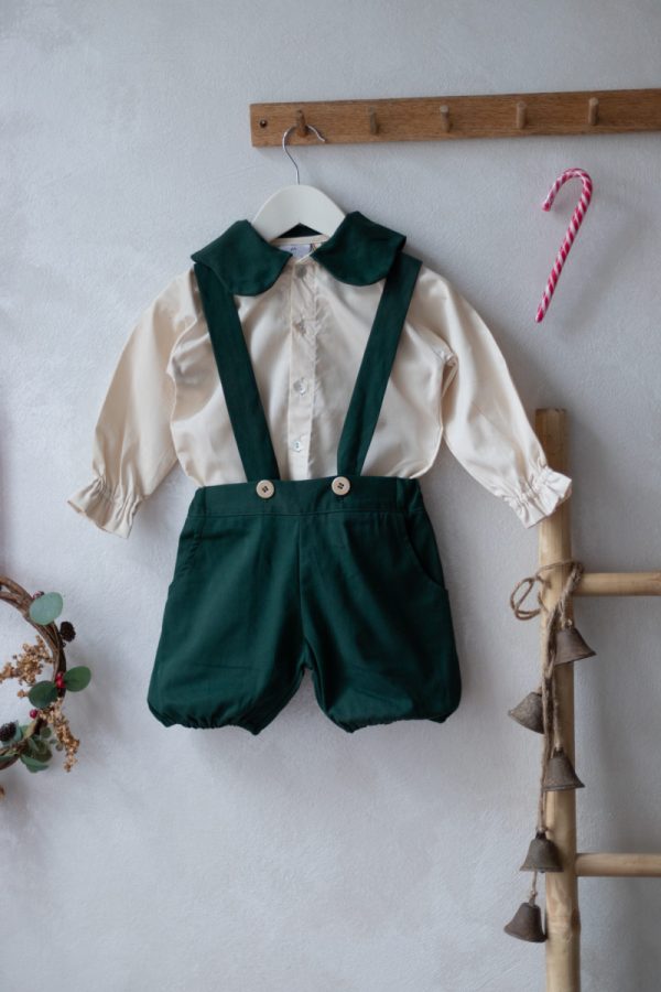 Camasa Nicholas este realizata dintr-un bumbac bej, accesorizata cu un guler verde inchis.
