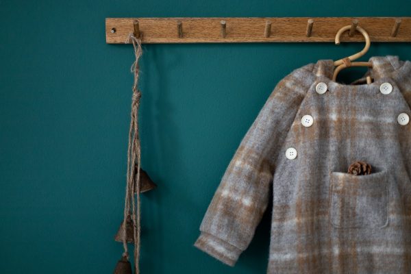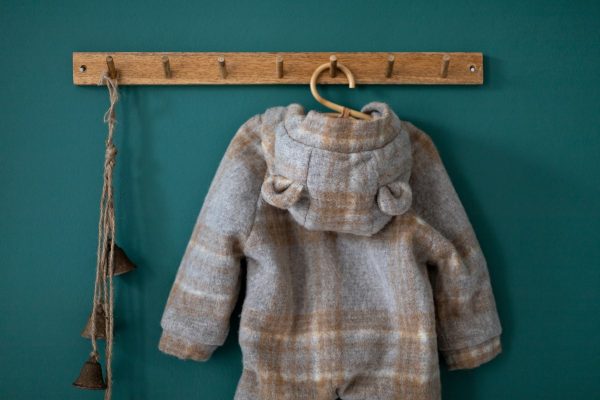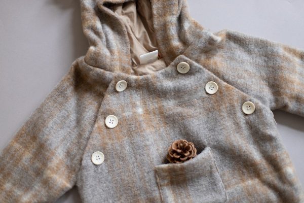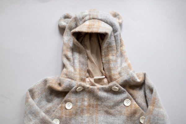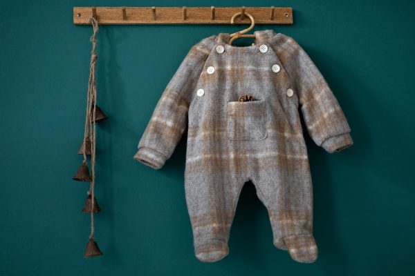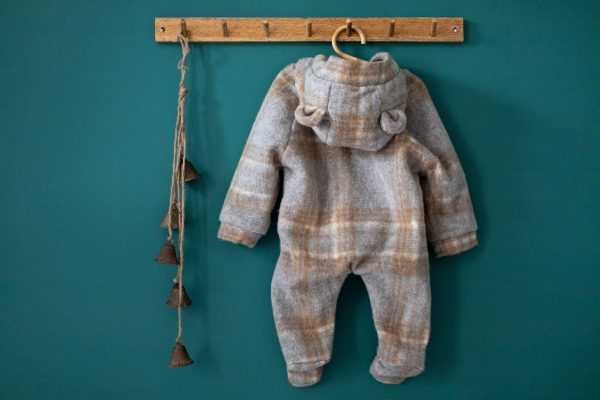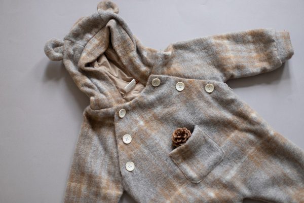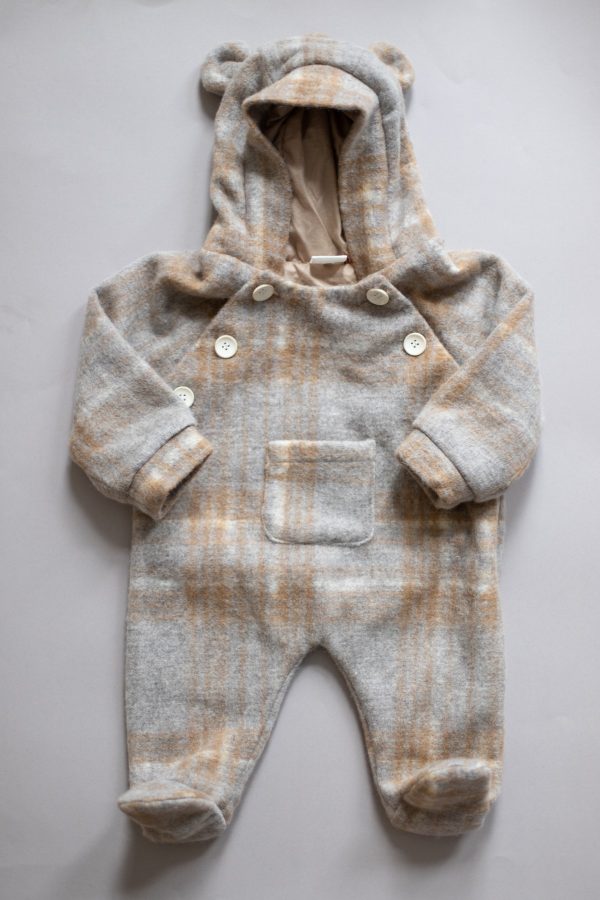 Combinezul Teddy bear realizat dintr-o stofa de lana naturala este captusit la interior cu bumbac fin. Are un fermoar lateral si inchidere in nasturei in partea de sus, pentru o imbracare mai rapida.