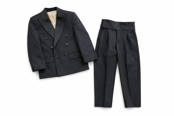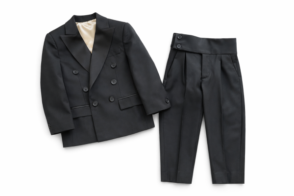 Costumul din stofa neagra naturala este realizat in colaborare cu Florin Dobre si se realizeaza ma masurile celui mic.