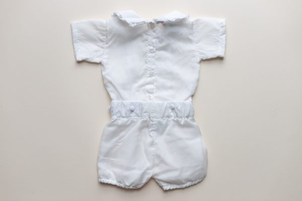 Camasuta cu maneca scurta are in talie 6 nasturei imbracati in matase naturala de care se prind pantalonii scurti, astfel se transforma intr-o salopetica.