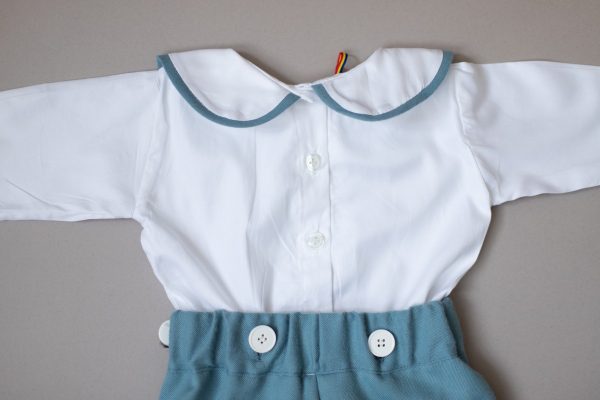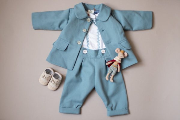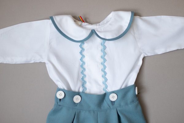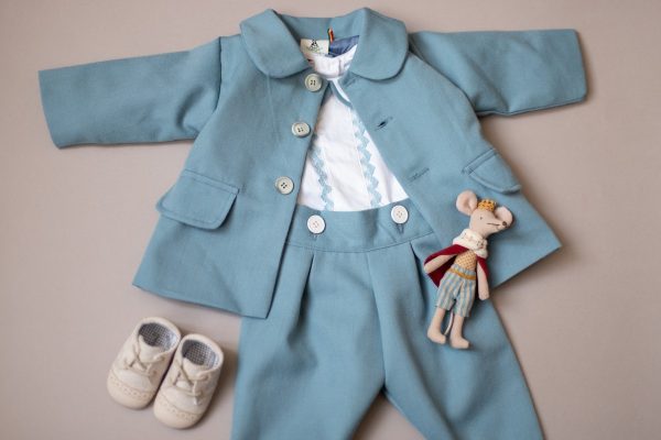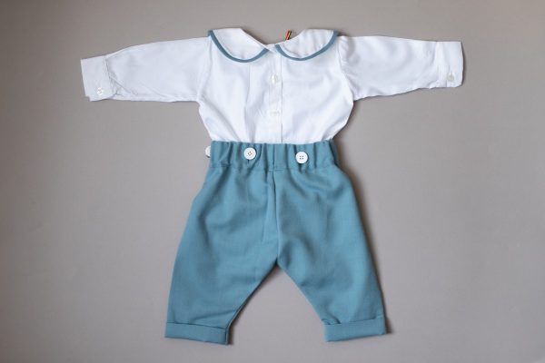 Camasa eete realizata dintr-un bumbac plin alb iar pantalonul dintr-o stofa de lana bleu captusita.