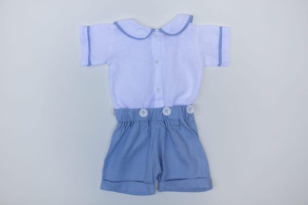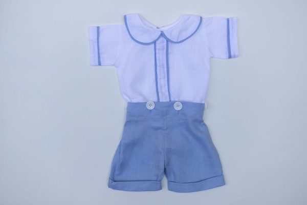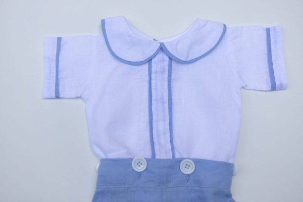 Costumul Bastian este realizat din in 100%, camasa cu maneca scurta in partea de sus si pantaloni din in bleu in partea de jos.