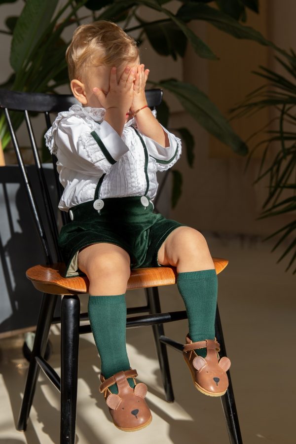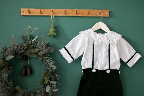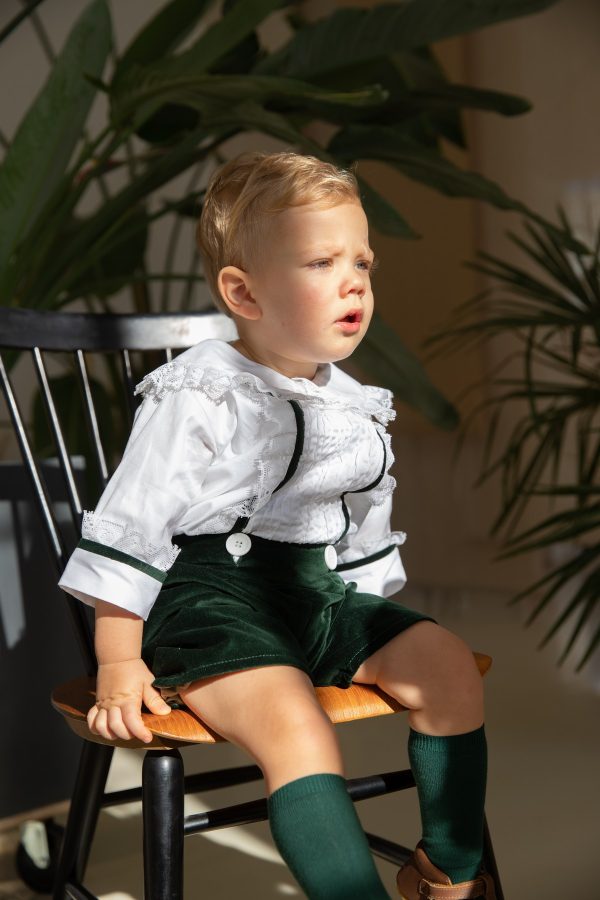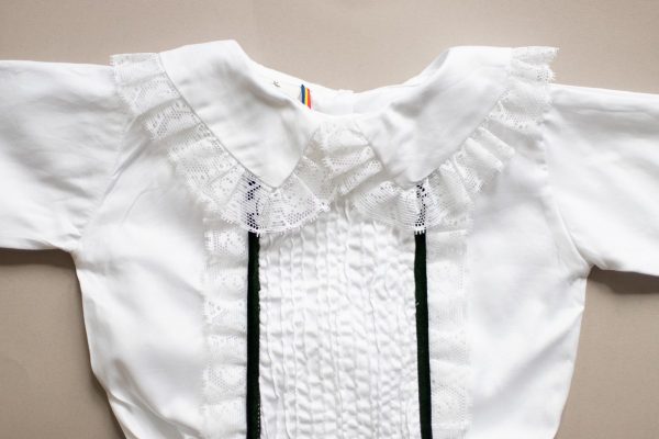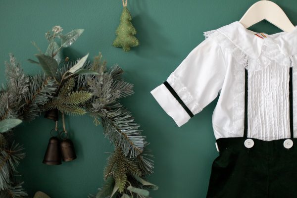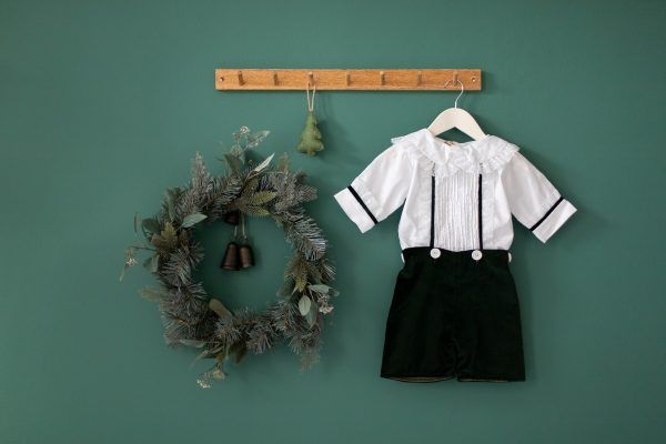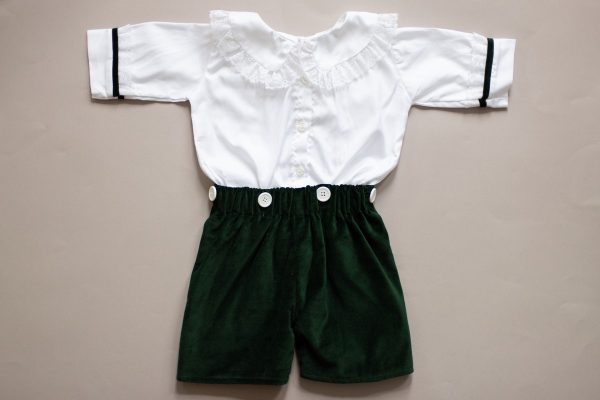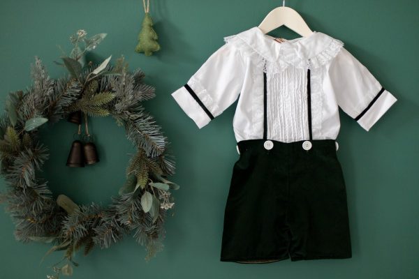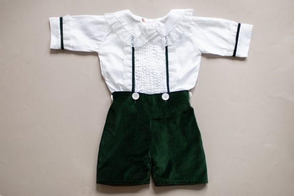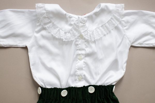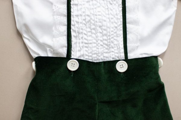Costumul Rene este realizata dintr-o combinatie de bumbac alb si catifea verde smarald, completat perfect de o broderie alba lata.