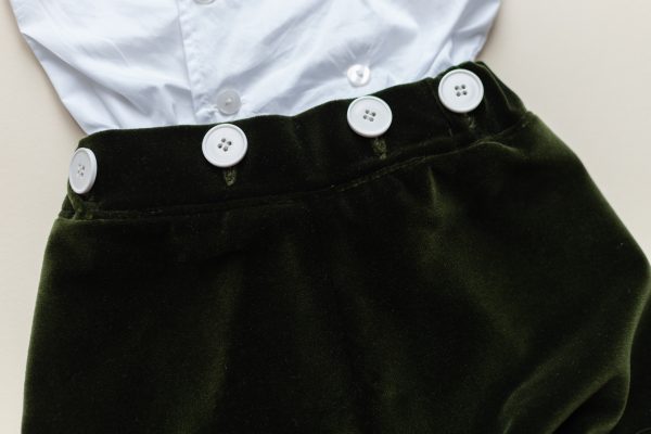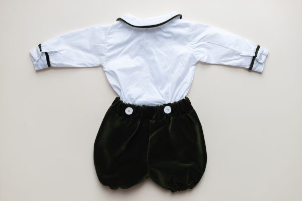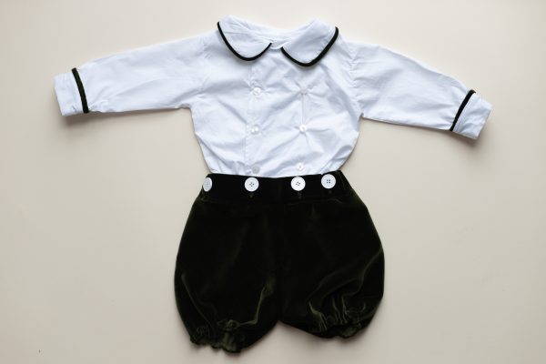 Costumul Renzo realizat dintr-o camasa de bumbac alb si un pantalon din catifea de bumbac verde, captusit cu bumbac natural, formeaza o salopeta prin prinderea pantalonului in cei 6 nasturei ai camasii.