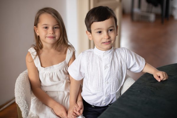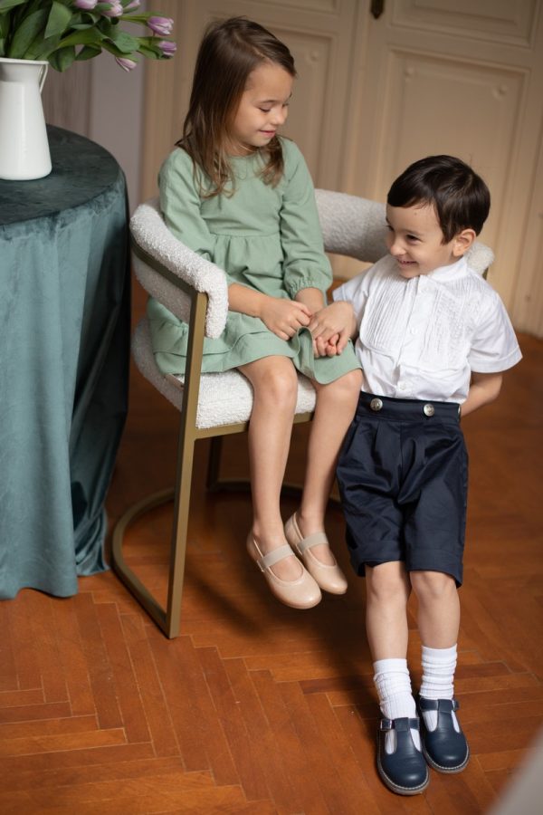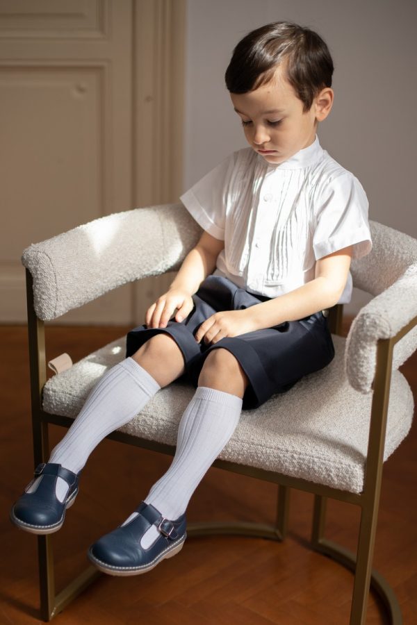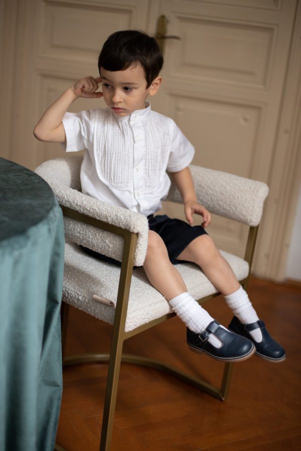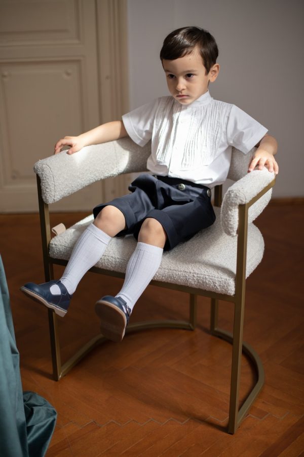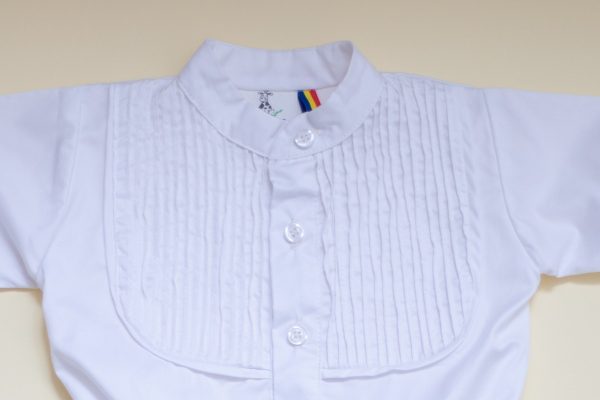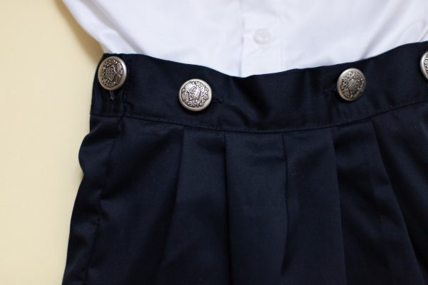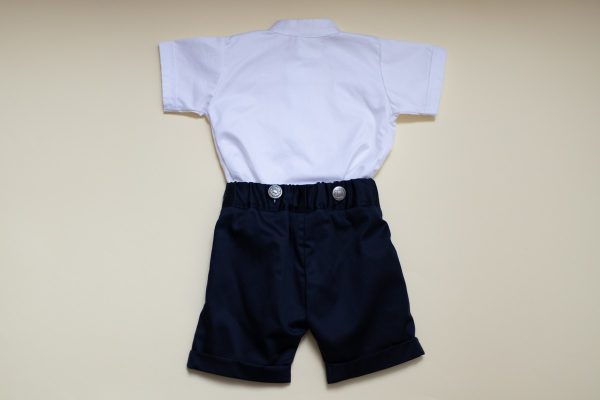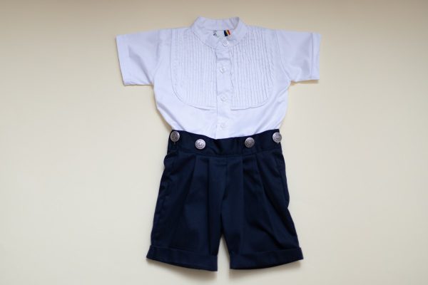 Costumul Theodor este compus dintr-o camasa din bumbac alb si un pantalon scurt din bumbac bleumarin. Inchiderea se realizeaza in 6 nasturei metalici argintii.