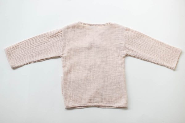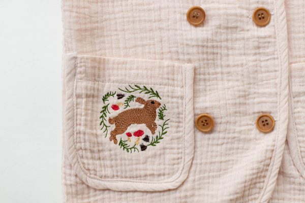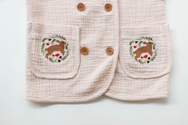 Haina Lapin este realizata dintr-o muselina de bumbac, moale si placuta la atingere. Este la doua randuri de nasturi si are aplicate doua buzunare cu o broderie unicata.