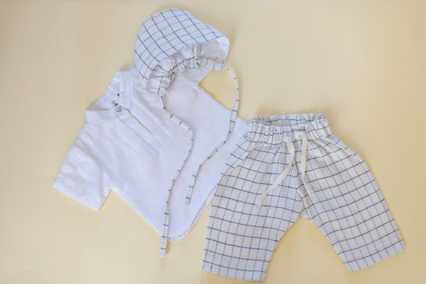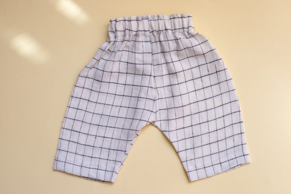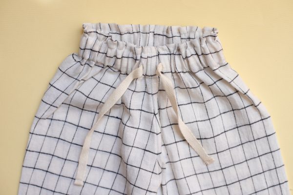 Pantalonul Thierry este realizat dintr-un in moale, alb in carouri, accesorizat cu snur in talie.