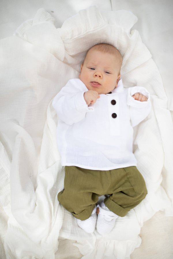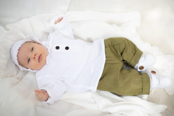 Pantalonii Christien sunt realizati dintr-un in moale, culoarea verde crud, accesorizati cu un snur din bumbac in partea din fata sk manseta jos.