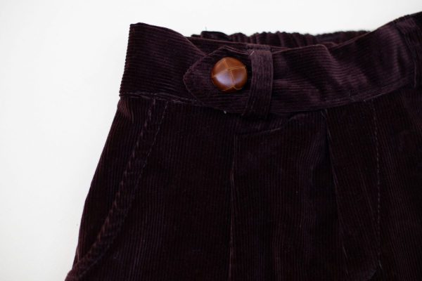 Pantalonii Aubert din bumbac raiat maro, sunt un model unisex, cu betelie fixa in partea din fata si elastic lat la spate, accesorizati cu un nasture impletit in fata si manseta in partea de jos.