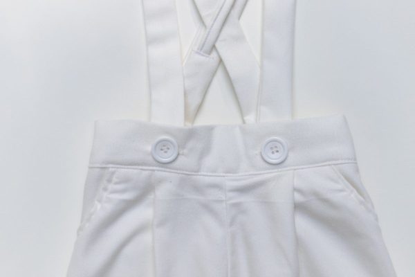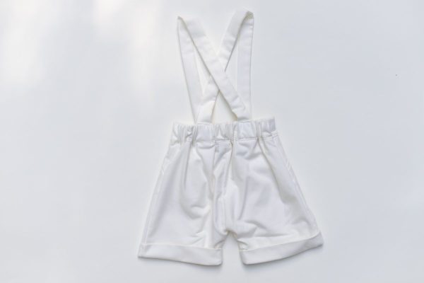 Pantalonii scurti cu bretele Philippe sunt realizati dintr-o stofa alba. Au manseta in partea de jos si elastic lat la spate.
