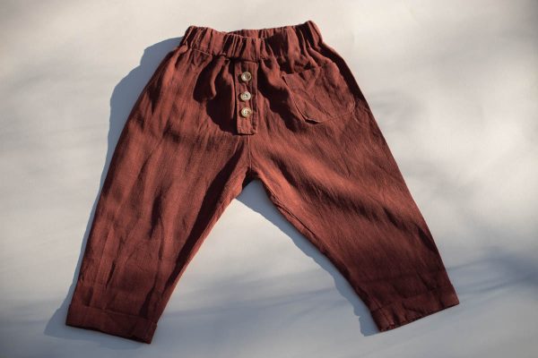 Pantalonii Serge sunt realizati dintr-un in moale maro, cu manseta jos si un buzunar aplicat in partea din fata.