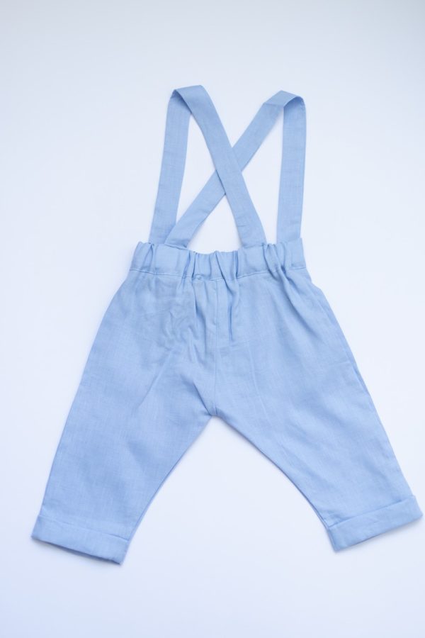 Pantalonul cu bretele Allan este realizat dintr-un in bleu, premium, accesorizat cu manseta si buzunare laterale.