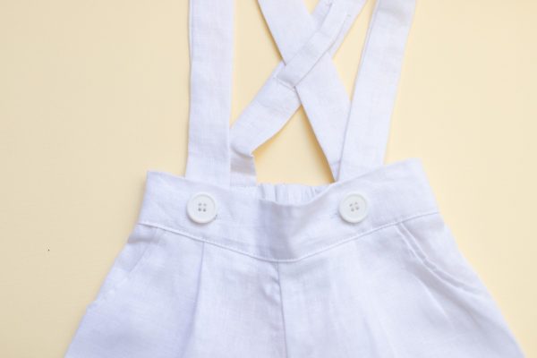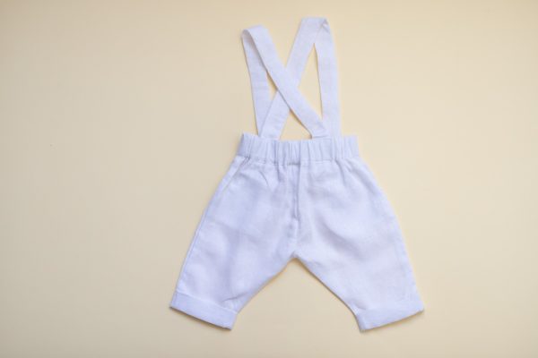Pantalonul cu bretele Edison este realizat dintr-un in alb, cu bretele si buzunare laterale.