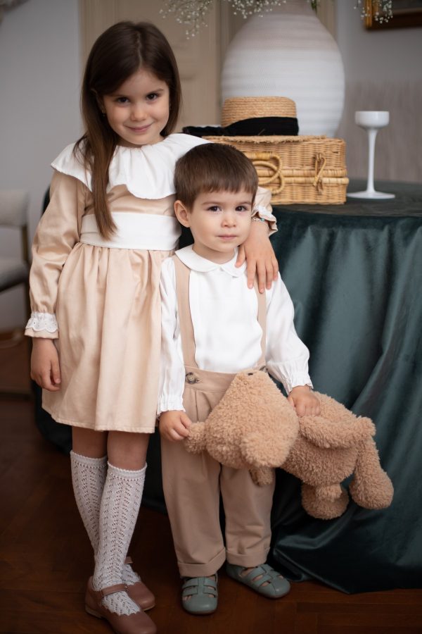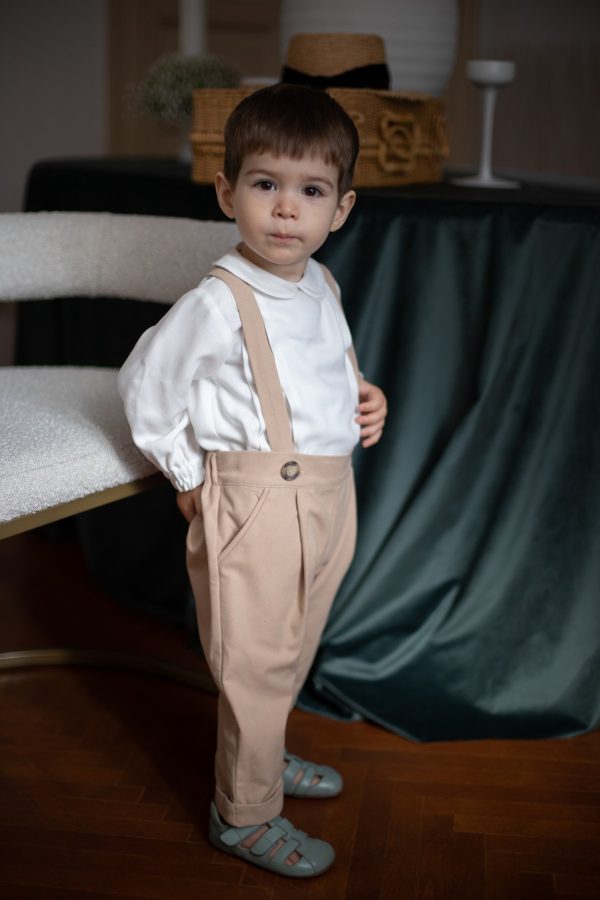 Pantalonul cu bretele Edi este realizat dintr-o stofa bej, moale si placuta la atingere.