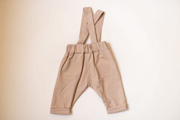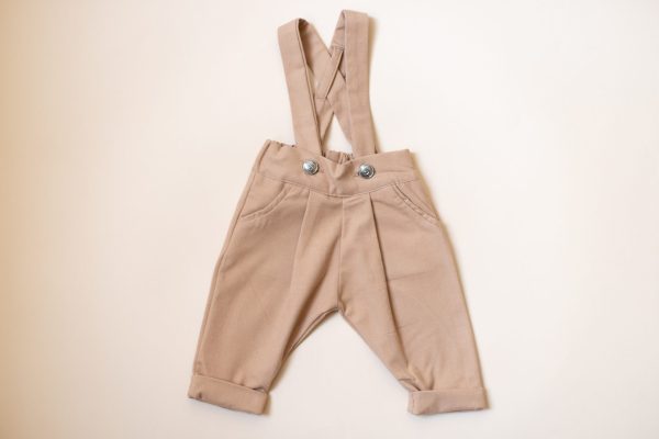 Pantalonul cu bretele John este realizat dintr-o stofa din lână naturala, culoarea bej, accesorizat cu nasturi metalici argintii.