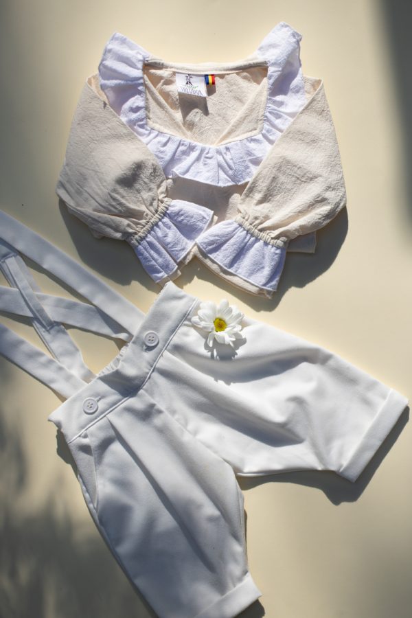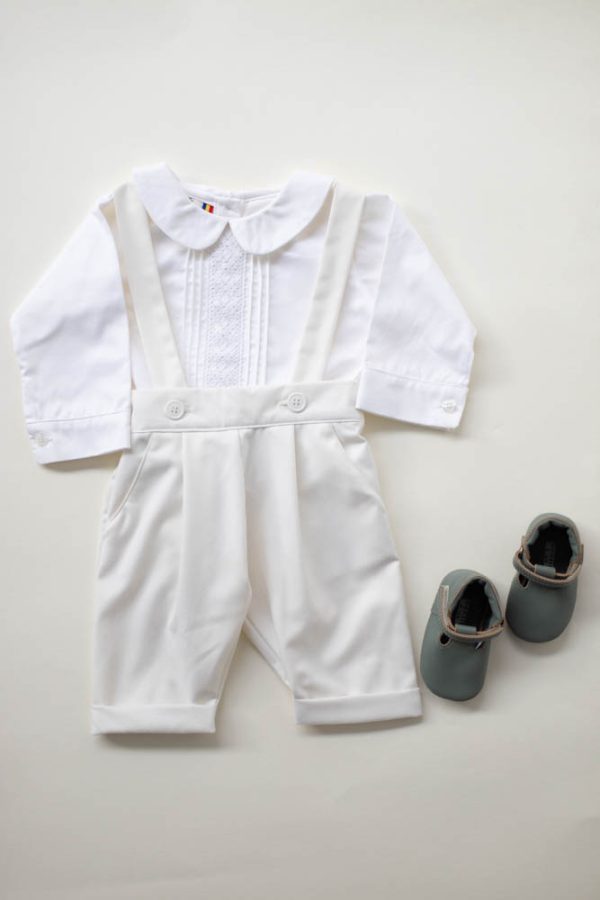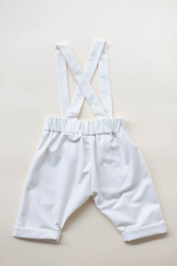 Pantalonul cu bretele Philippe este realizat dintr-o stofa de lana alba, moale si placut la atingere.
