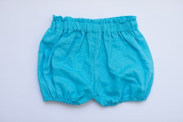 Pantalonul scurt Aris este realizat dintr-un in albastru, cu elastic la spate si patru nasturei in partea din fata.