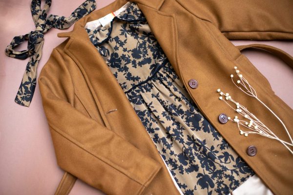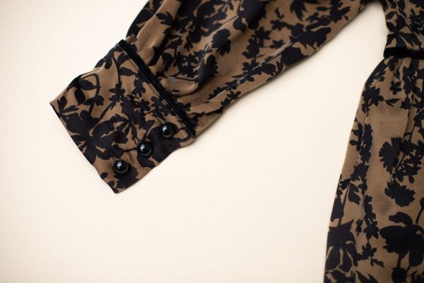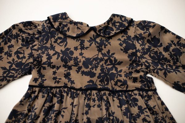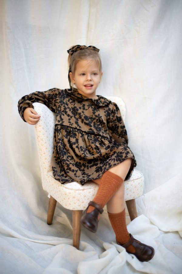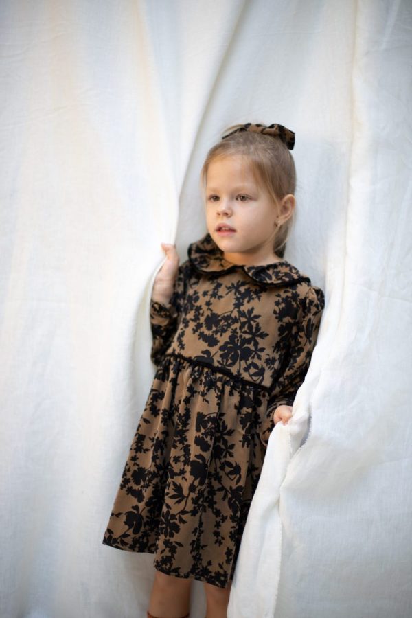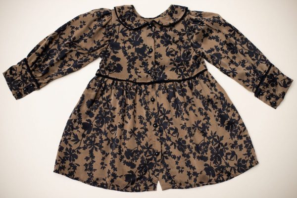 Rochia Alaina din vascoza cu matase, este accesorizata cu nasturei perla in partea din spate, guler rotund si o lira din catifea neagra la mansete, guler si talie.