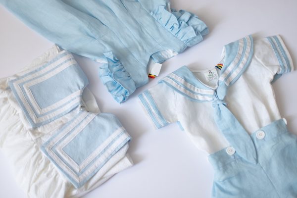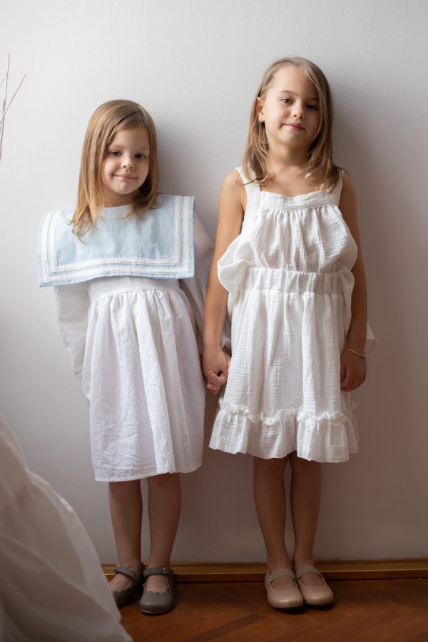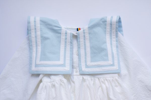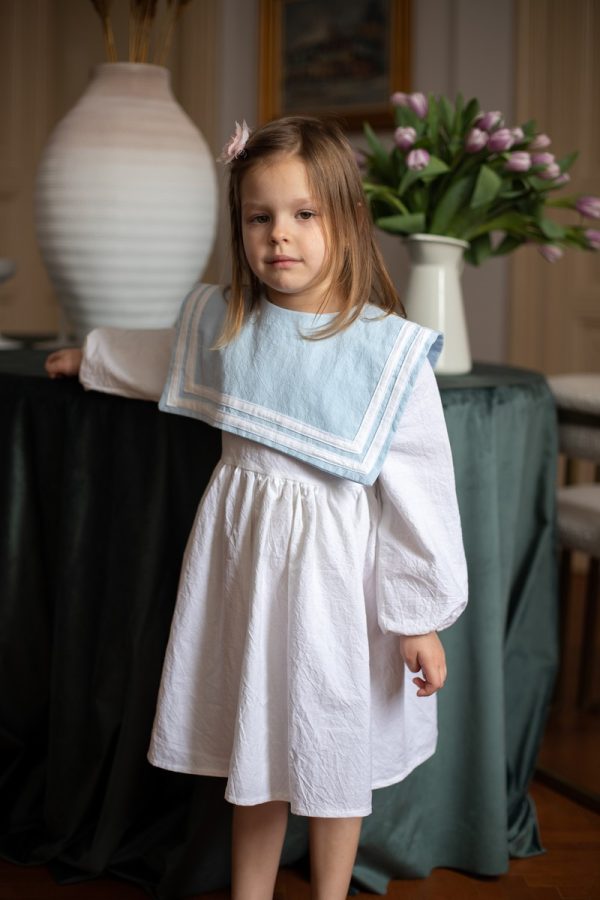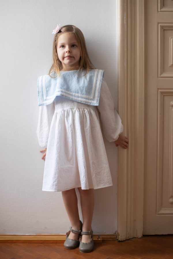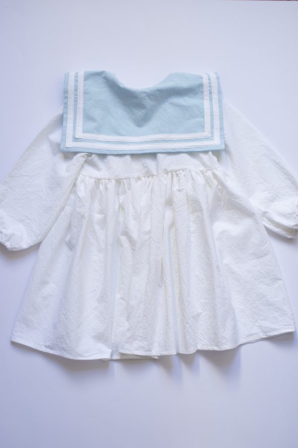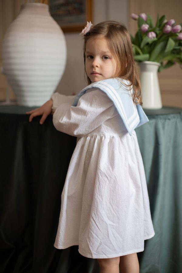 Rochia Anemona este realizata dintr-un bumbac natural, accesorizata cu un guler marinaresc.