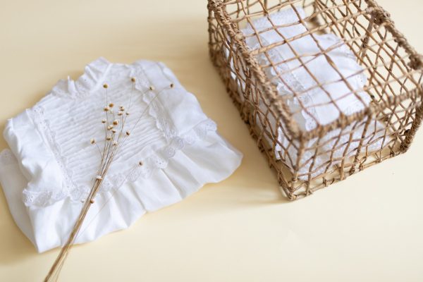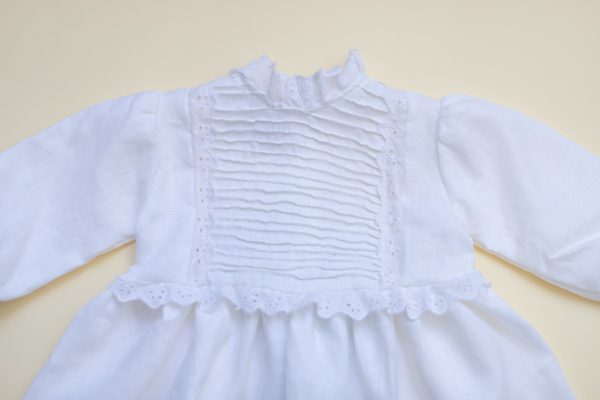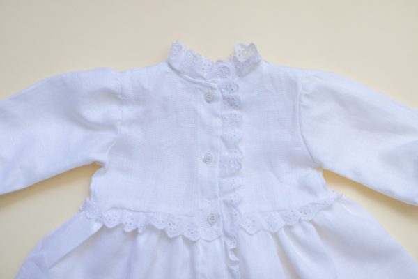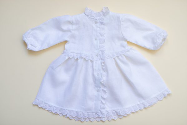 Rochia Aniela este realizata dintr-un in alb, moale si placut la atingere. Este accesorizata cu o dantela fina, alba si nasturei simpli la spate.