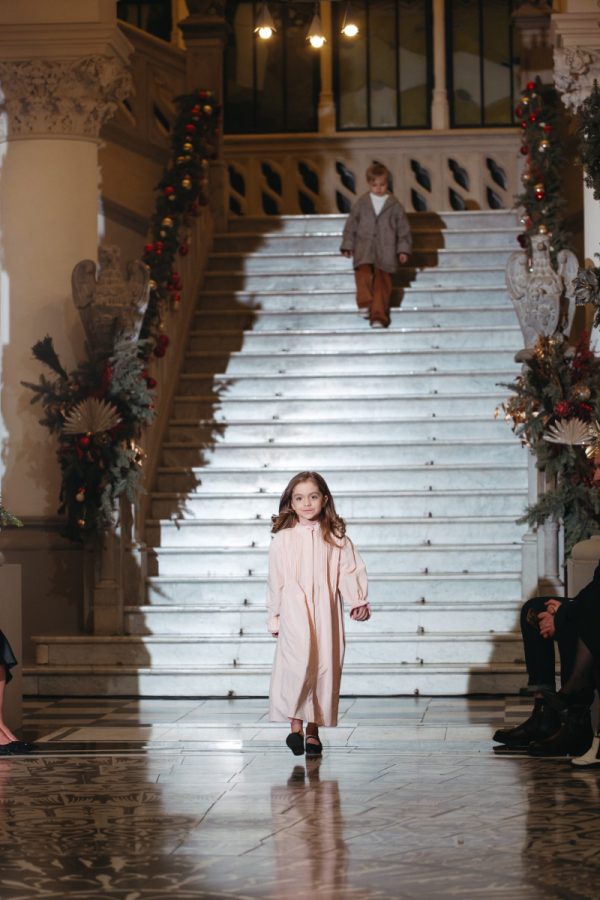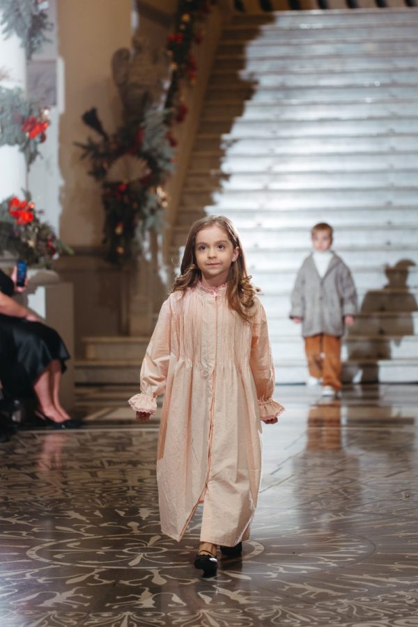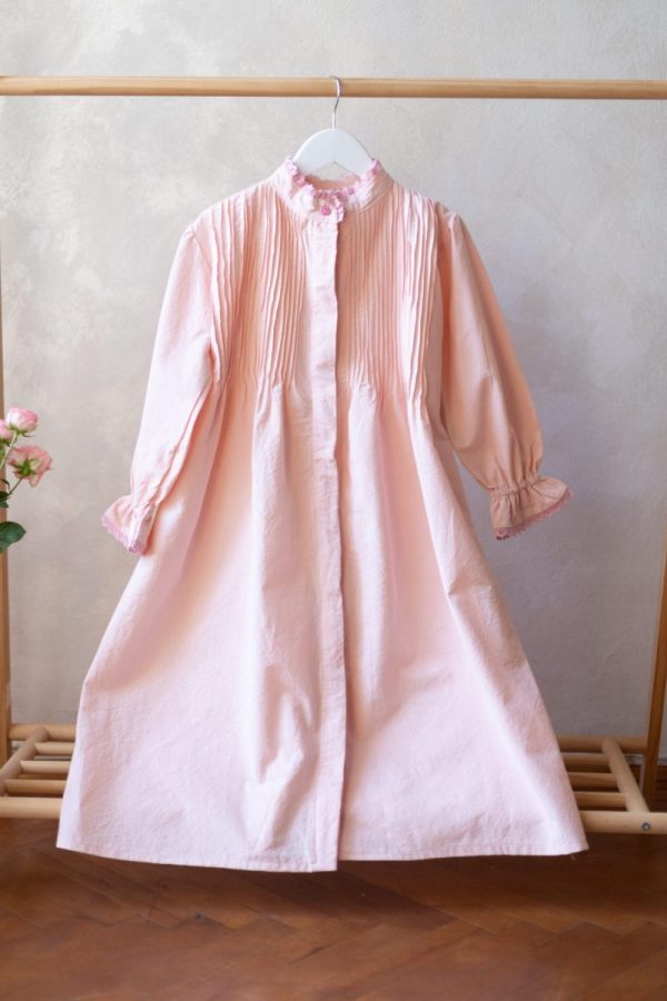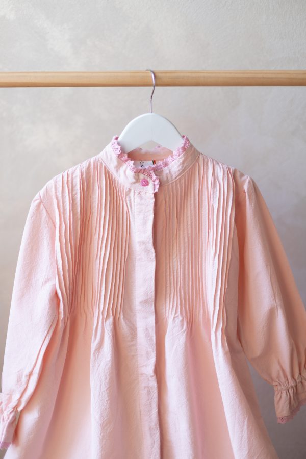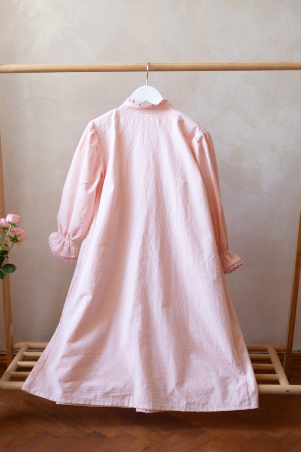 Rochia Asha realizată dintr-o pânză din bumbac natural, culoarea roz pudra, este accesorizata cu o dantela și volanas la mâneca și aceeași dantela din bumbac roz pudra și în partea de sus, în zona gâtului.
