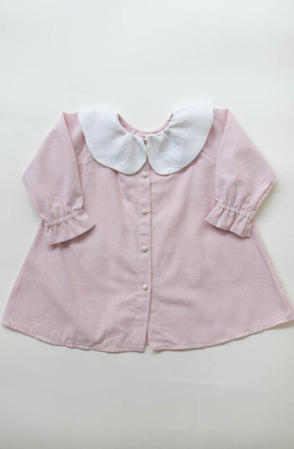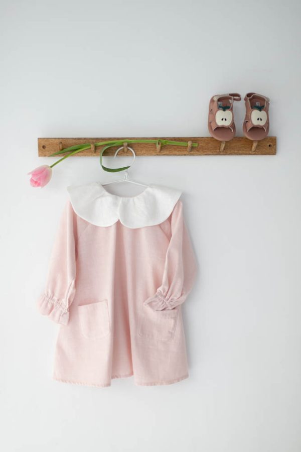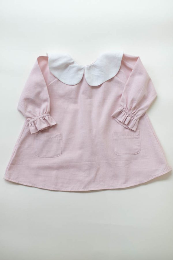 Rochia Ava din in roz pudra cu guler floare din in alb, are nasturei la spate si buzunare aplicate in partea din fata.