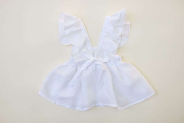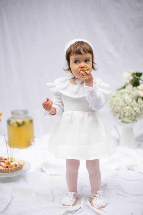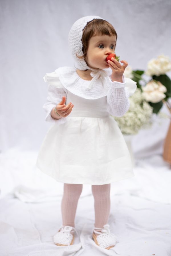 Rochia Diane este realizata dintr-un in moale, alb, captusita la interior cu un bumbac fin. Cu volanase pe maneci, rochia Diane are un aer diafan.