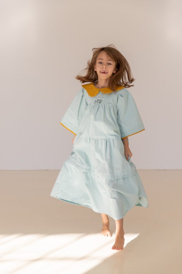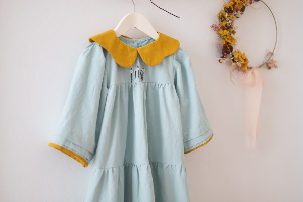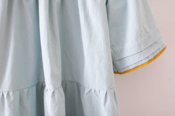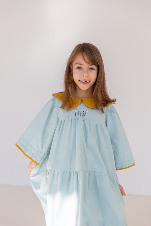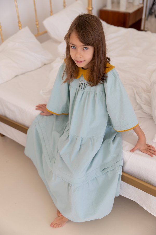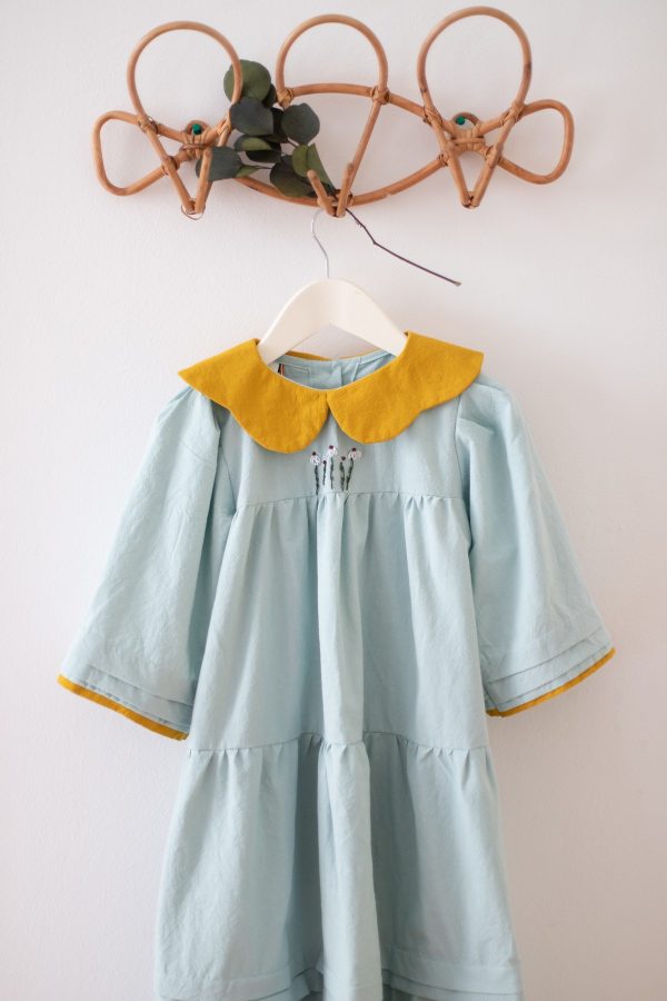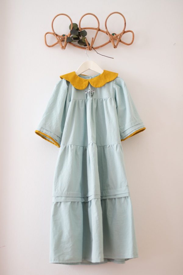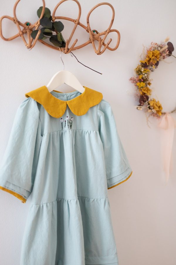 Rochia Eleonor realizata dintr-o panza topita, din bumbac natural, tesuta in Romania si accesorizata in partea din fata cu un model floral cusut manual, are un croi lejer si lungime maxi.