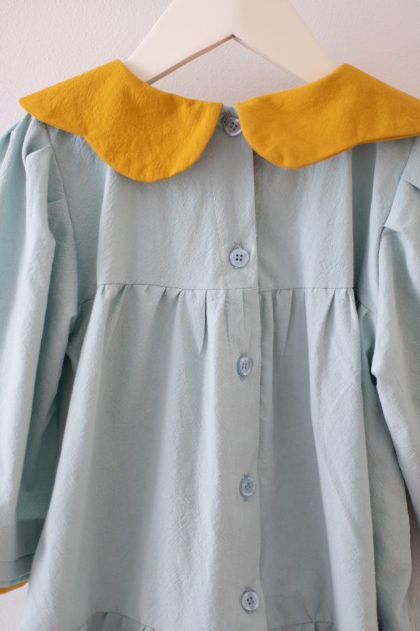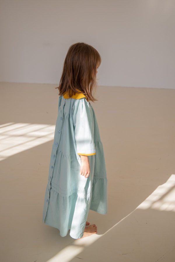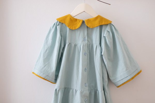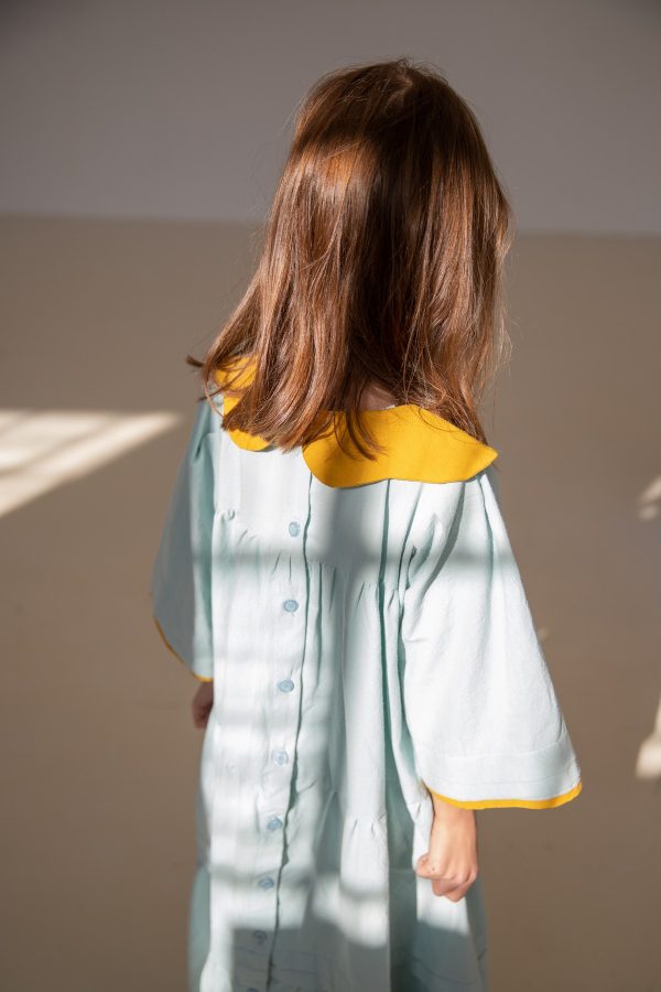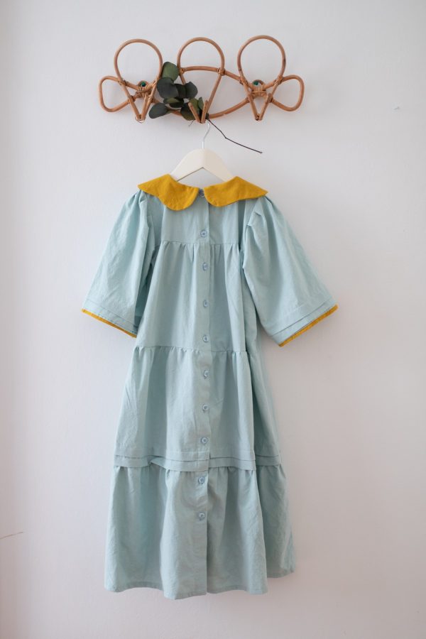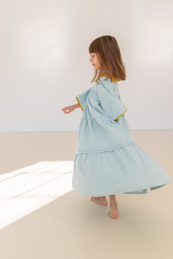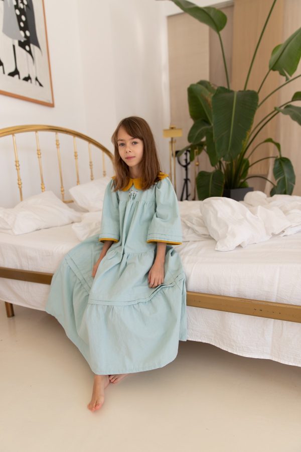 Rochia Eleonor realizata dintr-o panza topita, din bumbac natural, tesuta in Romania si accesorizata in partea din fata cu un model floral cusut manual, are un croi lejer si lungime maxi.