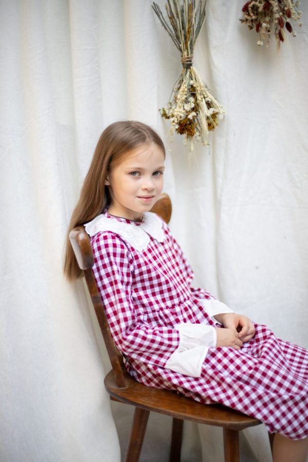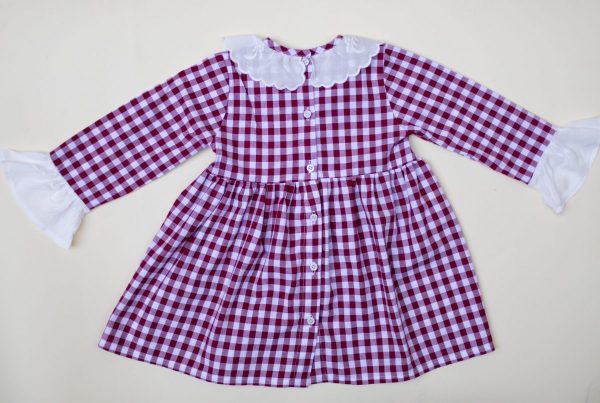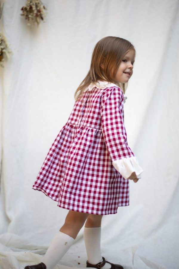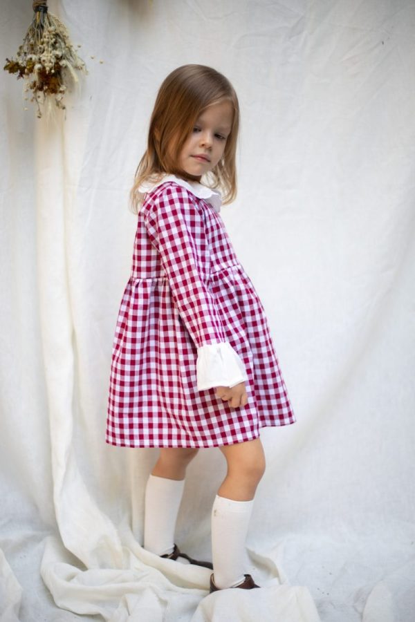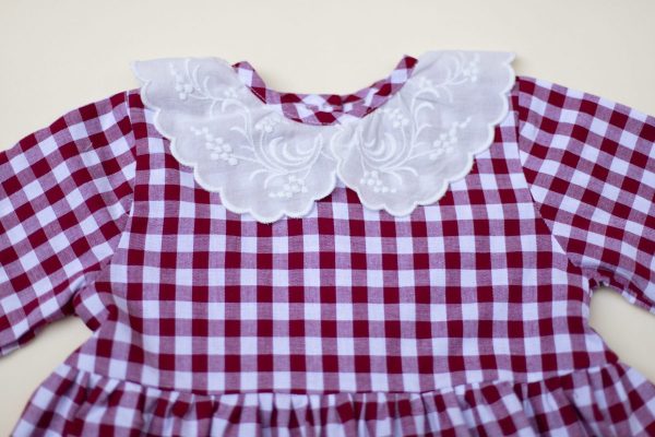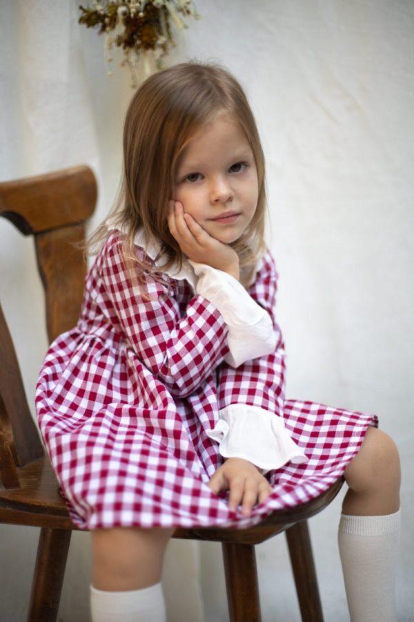Rochia Emma realizata dintr-un bumbac plin, in carouri, culoarea rosu-alb. este accesorizata cu volanse la maneca si un guler din bumbac brodat.