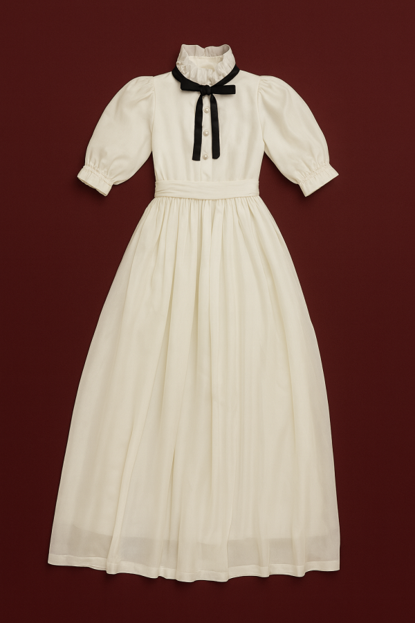 Rochia Eveline realizate dintr-o matase naturala si accesorizata cu un snur din catifea neagra. Maneca scurta si brau cu funda reglabila care se strange la spate.