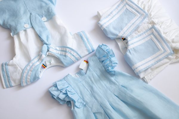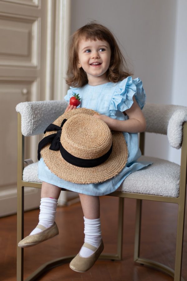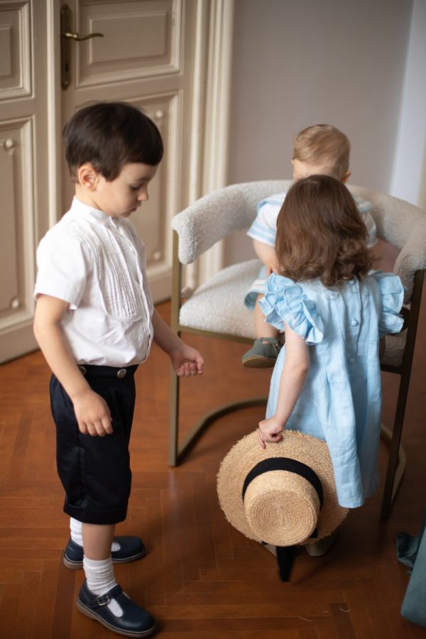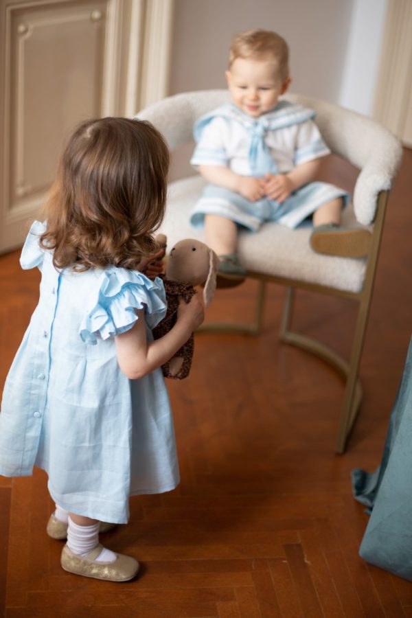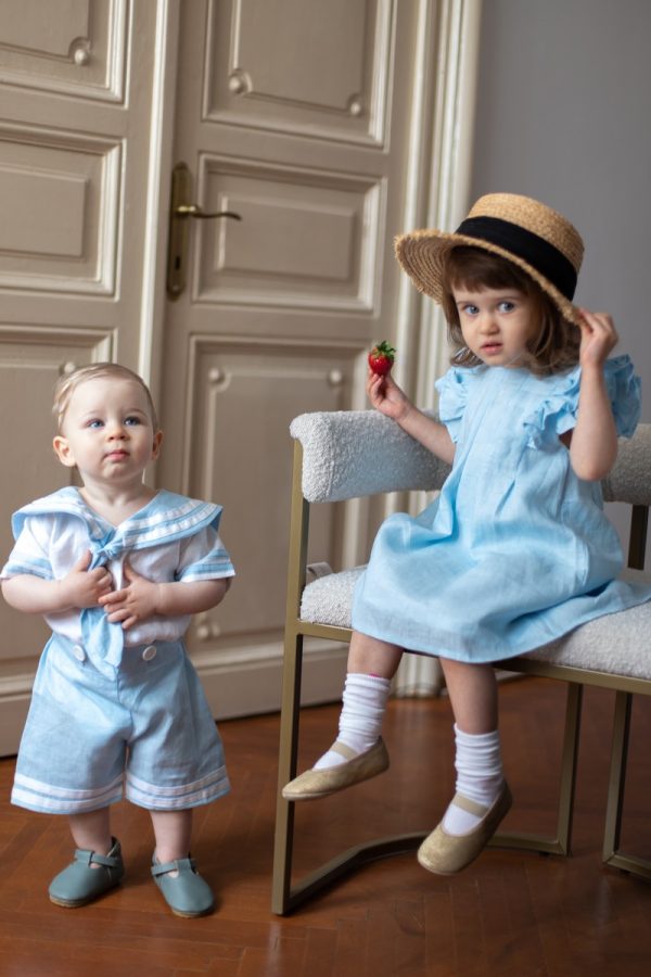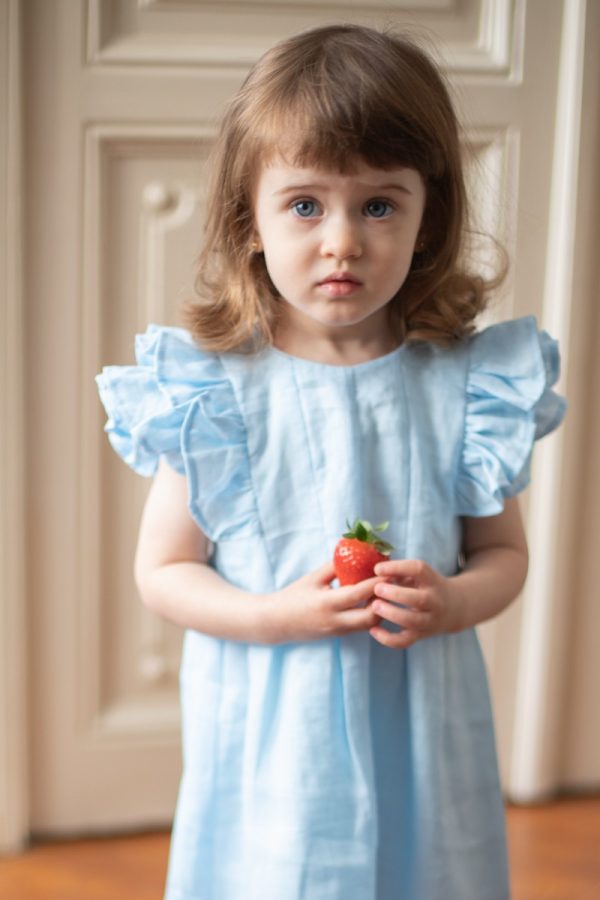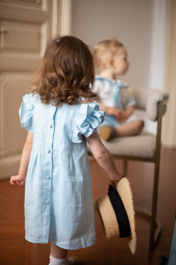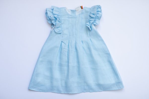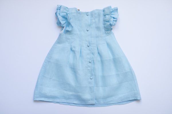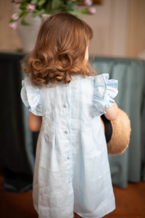 Rochia Helen este realizata dintr-un in bleu, premium, captusita la interior cu bumbac fin si accesorizata la spate cu nasturei imbracati.