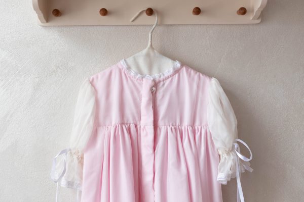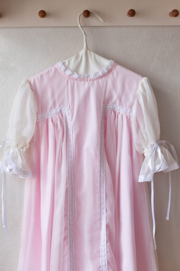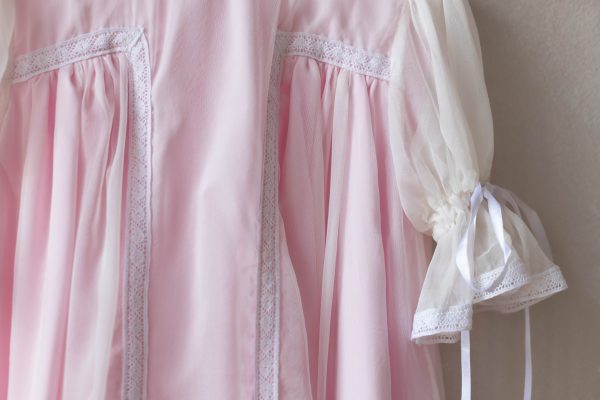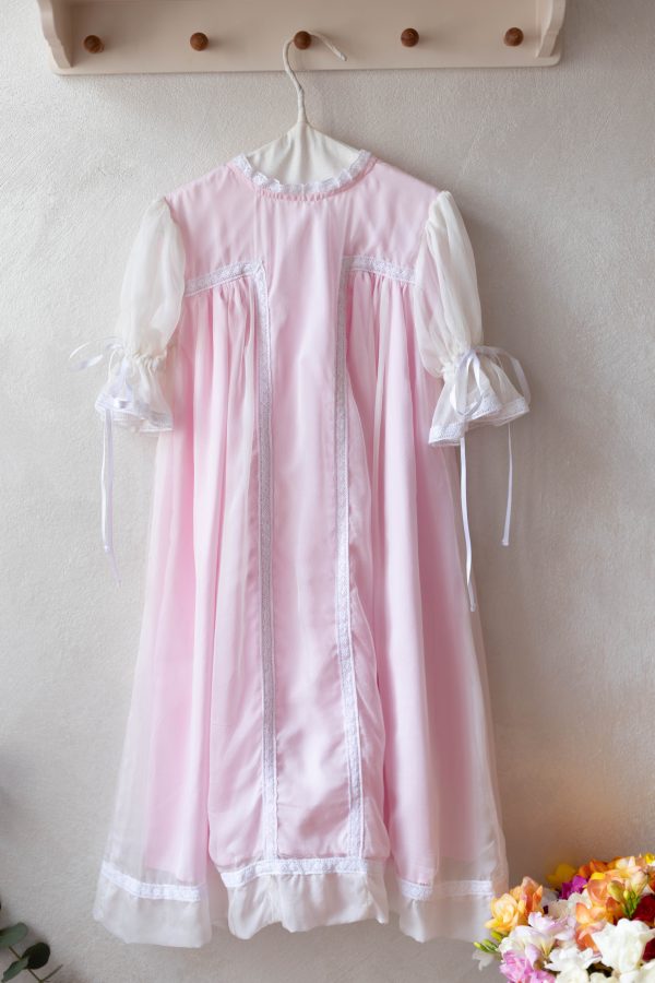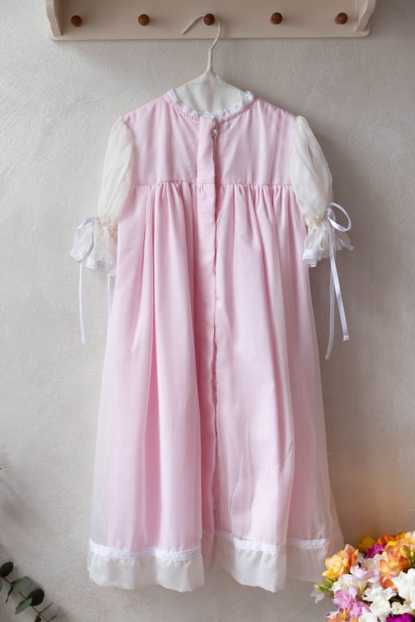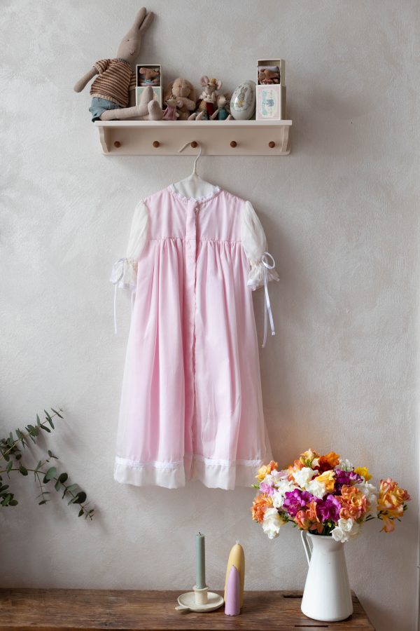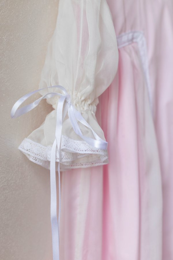Rochia Kate realiza dintr-un voal de matase alba, dublata cu bumbac roz pudra si completata perfect de o broderie alba, este ideala pentru micile printese.